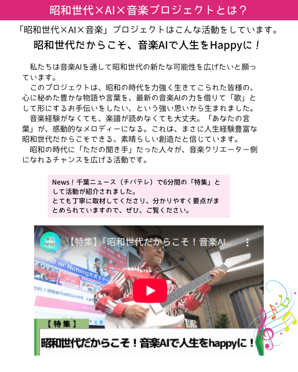 「ある日、テレビで目にした音楽AIに、その時思っていることを入れてみたら・・」60代の人生のひとコマを短い小説にして、その作品の中で出て来る「思いとことば」を使って生成したAI音楽を、挿入歌として創作しました。